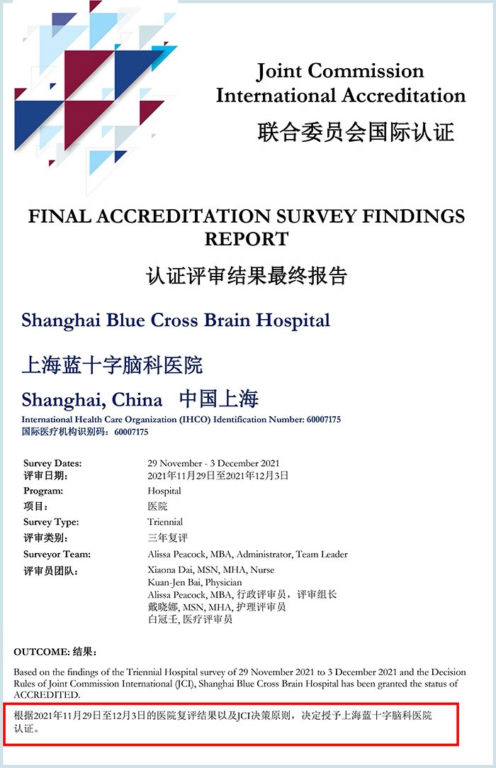 最后一天的總結(jié)大會(huì)上,Alissa女士在匯總了所有評(píng)審委員的結(jié)果后宣布,上海藍(lán)十字腦科醫(yī)院總得分9.89分。她還表示,所有評(píng)審委員一致認(rèn)可,將向國(guó)際JCI評(píng)審委員會(huì)著力推薦醫(yī)院通過(guò)本次認(rèn)證評(píng)審。