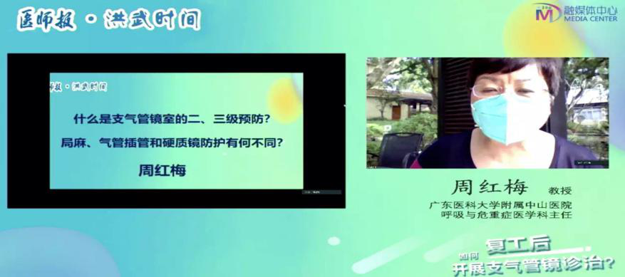 周紅梅教授是今年新冠肺炎期間去湖北一線援鄂的醫(yī)生,是原廣東醫(yī)科大學(xué)附屬中山醫(yī)院主任,教授,學(xué)科帶頭人,在援鄂回粵的醫(yī)學(xué)隔離觀察期間,于2020年3月24日就應(yīng)邀參加了由《醫(yī)師報·洪武時間》主辦的首場直播,做“新冠肺炎疫情期間支氣管鏡室的二、三級預(yù)防,局麻、氣管插管和硬質(zhì)鏡防護(hù)有何不同”專題講座。