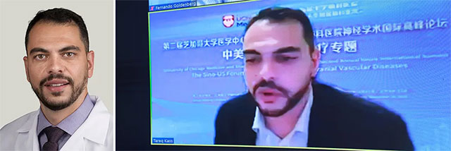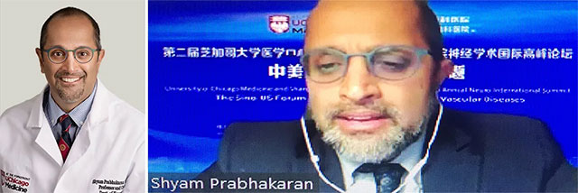 UCM神經(jīng)科主任Shyam Prabhakaran, M.D.首先簡單介紹了芝加哥大學神經(jīng)科學中心的12位杰出專家學者、兩大享譽世界的神經(jīng)科學項目、四大神經(jīng)科和神經(jīng)外科中心及項目。隨后以《顱內狹窄的藥物治療和介入干預》為題,從顱內動脈粥樣硬化狹窄(ICAD)背景、診斷和機制、治療選擇、MYRIAD試驗的發(fā)現(xiàn)和展望等方面進行闡釋,研究復發(fā)卒中伴有癥狀的ICAD患者的自然病程;引用之前的介入治療和藥物治療的臨床試驗以減少ICAD患者再發(fā)卒中的風險;評估卒中的各種機制,探索未來針對有癥狀ICAD患者的臨床試驗的潛在治療目標,同時分析了目前面臨的挑戰(zhàn)。