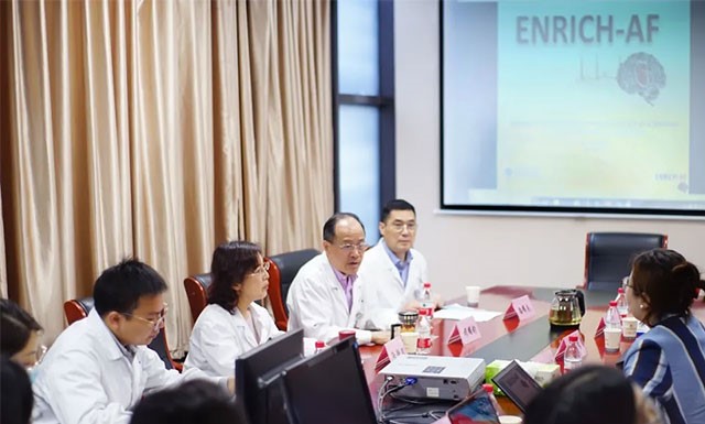 在交流環(huán)節(jié),張靜波主任及科室醫(yī)生先后發(fā)言。并針對喬治全球健康研究院研究助理陳晨、項目經(jīng)理楊昭關于 ENRICH-AF設計方案、設計流程等具體內(nèi)容及臨床上遇到的相關情況進行探討。