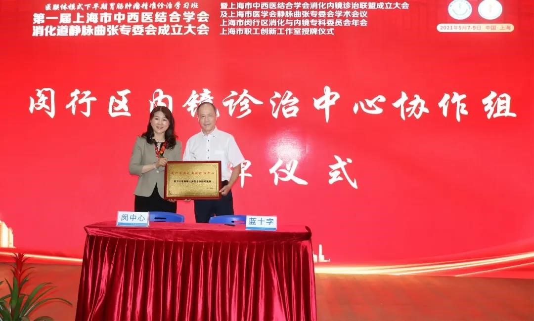 2021年5月7-9日,醫聯體模式下早期胃腸腫瘤精準診治學習班暨第一屆上海市中西醫結合學會消化道靜脈曲張專委會成立大會、上海市中西醫結合學會消化內鏡診治聯盟成立大會及上海市醫學會靜脈曲張專委會學術會議、上海市閔行區消化與內鏡??莆瘑T會年會、上海市職工創新工作室授牌儀式在復旦大學附屬閔行醫院舉行。