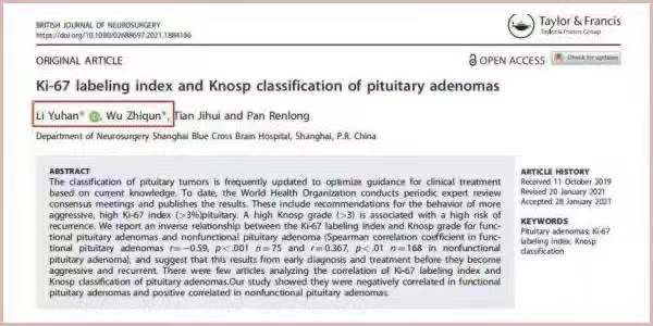 吳治群博士還以共一作者身份在影響因子為1.29的《英國神經(jīng)外科雜志》發(fā)表題為“Ki-67 labeling index and Knosp classification of pituitary adenomas”(中文:垂體腺瘤Ki-67標記指數(shù)和Knosp分類)的論文。