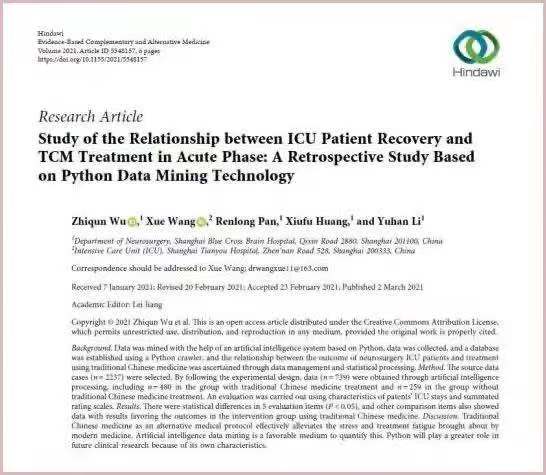 近日,公司旗下上海藍十字腦科醫(yī)院神經(jīng)外科6B病區(qū)副主任吳治群博士以第一作者身份在影響因子為1.843的《循環(huán)補充和替代醫(yī)學》期刊發(fā)表題為“Study of the Relationship between ICU Patient Recovery and TCM Treatment in Acute Phase:A Retrospective Study Based on Python Data Mining Technology”(中文:基于Python數(shù)據(jù)挖掘技術(shù)的ICU患者急性期康復與中醫(yī)治療關(guān)系的回顧性研究)的研究論著。