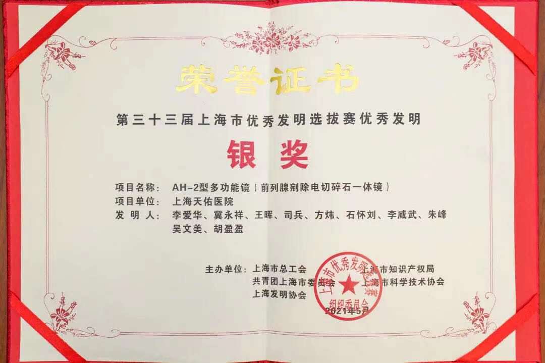 近日,“第三十三屆上海市優秀發明選拔賽”獲獎項目名單正式揭曉。公司旗下上海天佑醫院泌尿外科主任李愛華團隊研發的AH-2型多功能鏡(前列腺剜除電切碎石一體鏡)榮獲優秀發明銀獎。