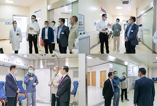 劉青樂教授、陸朝暉教授在醫院領導陪同下,參觀了ICU、康復治療大廳及高壓氧治療中心。兩位教授對溫馨整潔的醫院環境、醫護人員工作風貌、高壓氧艙內部環境及設備配置交口稱譽。