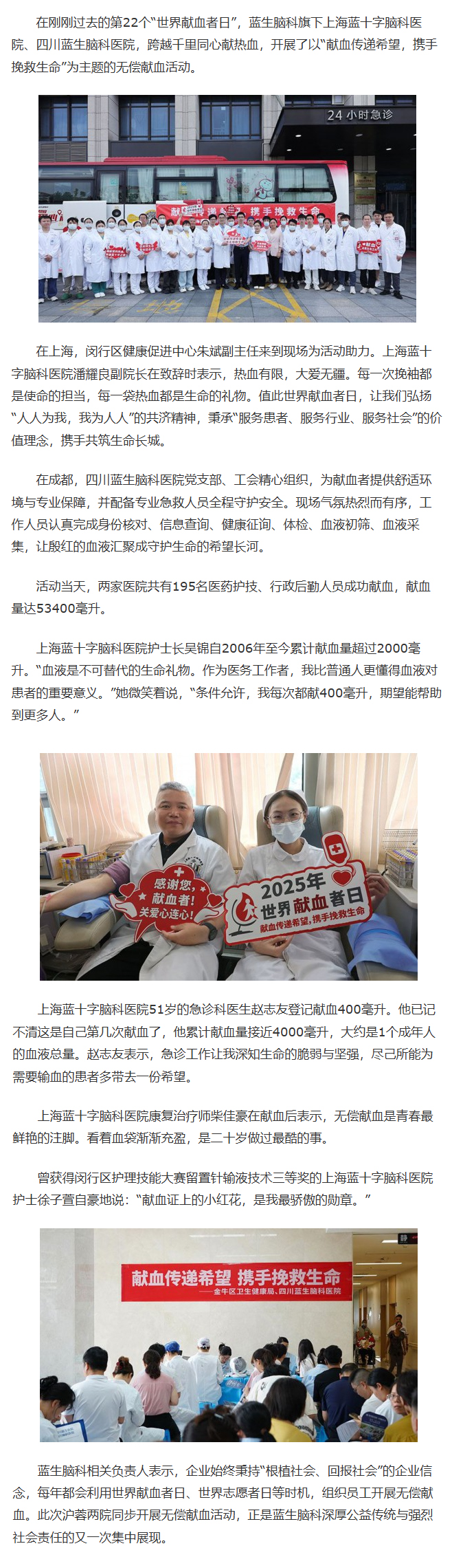 在剛剛過去的第22個“世界獻血者日”,藍生腦科旗下上海藍十字腦科醫(yī)院、四川藍生腦科醫(yī)院,跨越千里同心獻熱血,開展了以“獻血傳遞希望,攜手挽救生命”為主題的無償獻血活動。