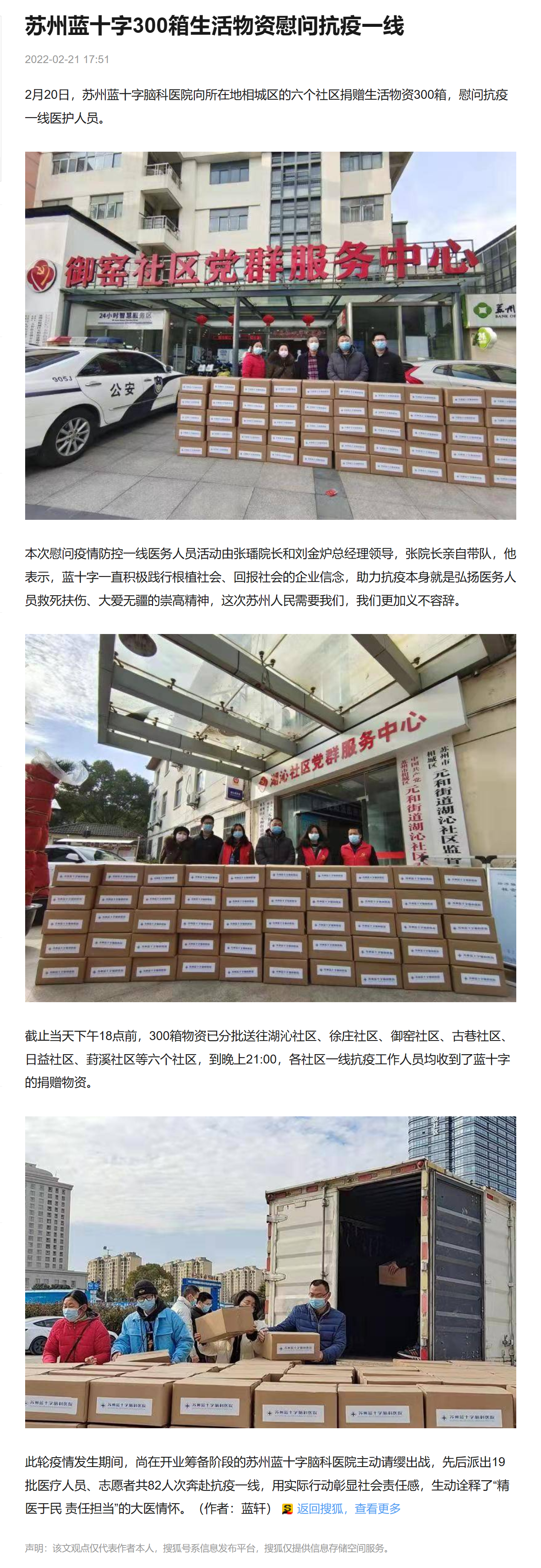 2月20日,蘇州藍十字腦科醫院向所在地相城區的六個社區捐贈生活物資300箱,慰問抗疫一線醫護人員。