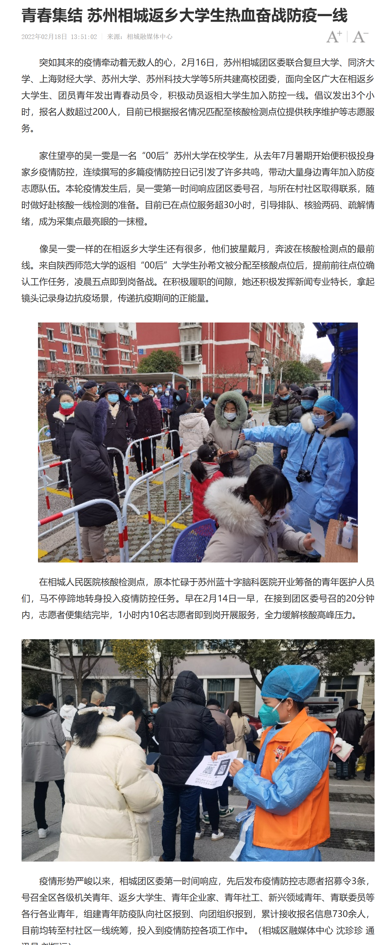 突如其來的疫情牽動著無數(shù)人的心,2月16日,蘇州相城團區(qū)委聯(lián)合復(fù)旦大學、同濟大學、上海財經(jīng)大學、蘇州大學、蘇州科技大學等5所共建高校團委,面向全區(qū)廣大在相返鄉(xiāng)大學生、團員青年發(fā)出青春動員令,積極動員返相大學生加入防控一線。倡議發(fā)出3個小時,報名人數(shù)超過200人,目前已根據(jù)報名情況匹配至核酸檢測點位提供秩序維護等志愿服務(wù)。