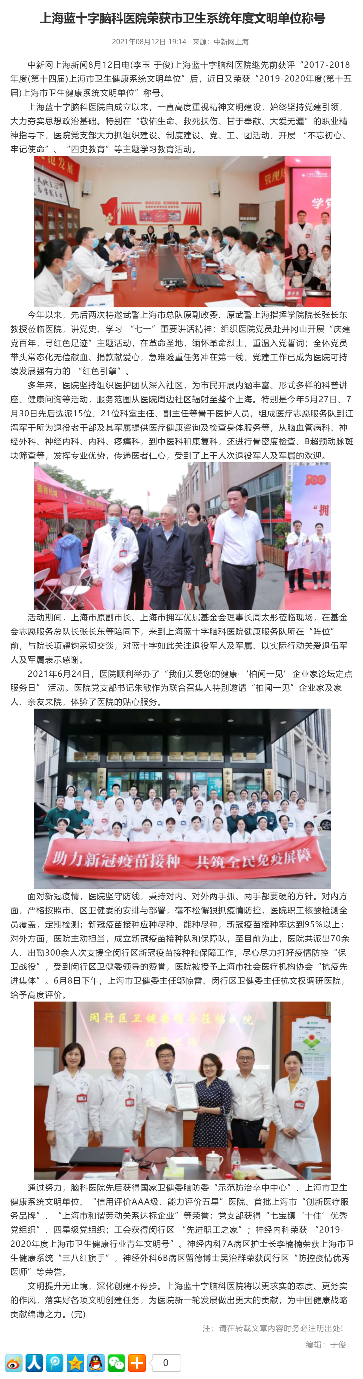 中新網上海新聞8月12日電(李玉 于俊)上海藍十字腦科醫院繼先前獲評“2017-2018年度(第十四屆)上海市衛生健康系統文明單位”后,近日又榮獲“2019-2020年度(第十五屆)上海市衛生健康系統文明單位”稱號。
