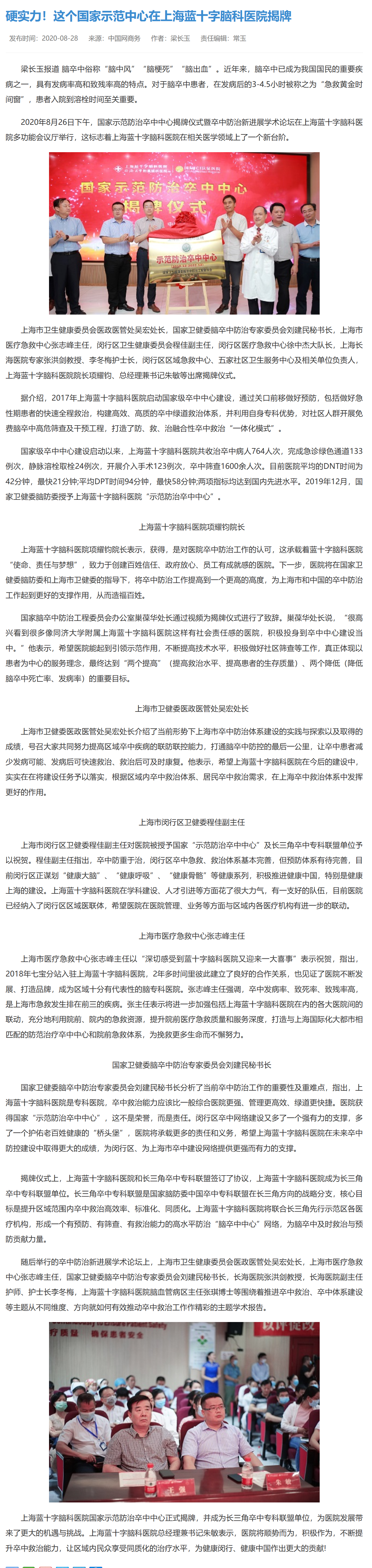 2020年8月26日下午,國(guó)家示范防治卒中中心揭牌儀式暨卒中防治新進(jìn)展學(xué)術(shù)論壇在上海藍(lán)十字腦科醫(yī)院多功能會(huì)議廳舉行,這標(biāo)志著上海藍(lán)十字腦科醫(yī)院在相關(guān)醫(yī)學(xué)領(lǐng)域上了一個(gè)新臺(tái)階。