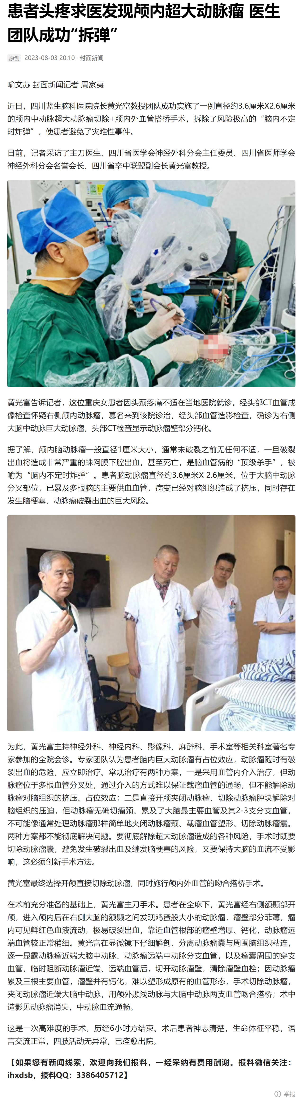 近日,四川藍生腦科醫院院長黃光富教授團隊成功實施了一例直徑約3.6厘米X2.6厘米的顱內中動脈超大動脈瘤切除+顱內外血管搭橋手術,拆除了風險極高的“腦內不定時炸彈”,使患者避免了災難性事件。