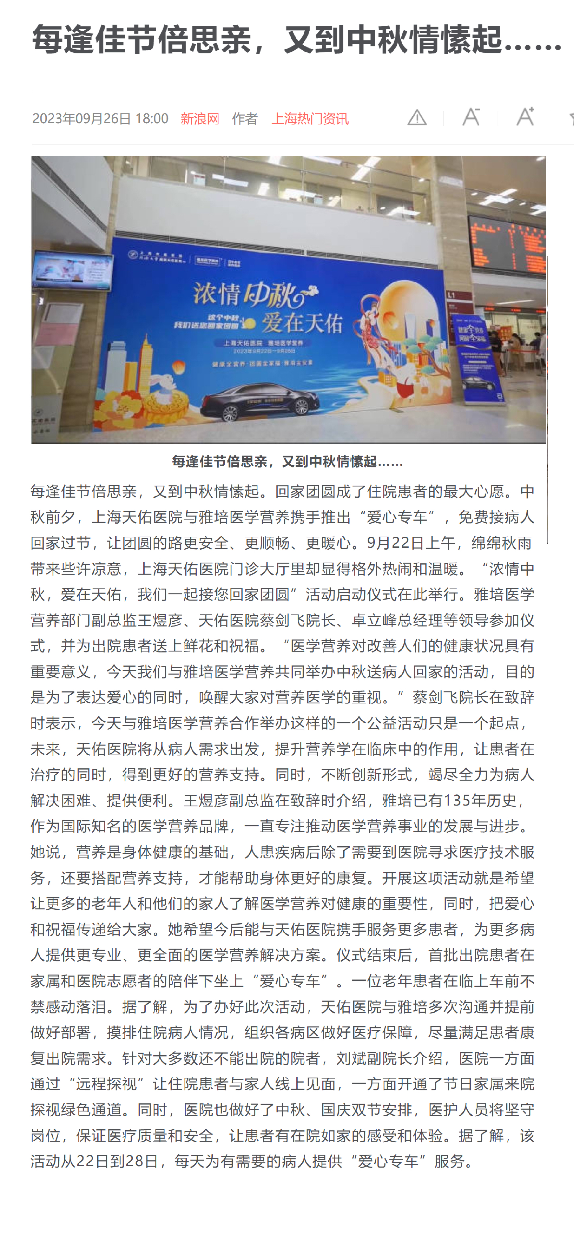 每逢佳節(jié)倍思親,又到中秋情愫起。回家團圓成了住院患者的最大心愿。中秋前夕,上海天佑醫(yī)院與雅培醫(yī)學營養(yǎng)攜手推出“愛心專車”,免費接病人回家過節(jié),讓團圓的路更安全、更順暢、更暖心。9月22日上午,綿綿秋雨帶來些許涼意,上海天佑醫(yī)院門診大廳里卻顯得格外熱鬧和溫暖。“濃情中秋,愛在天佑,我們一起接您回家團圓”活動啟動儀式在此舉行。