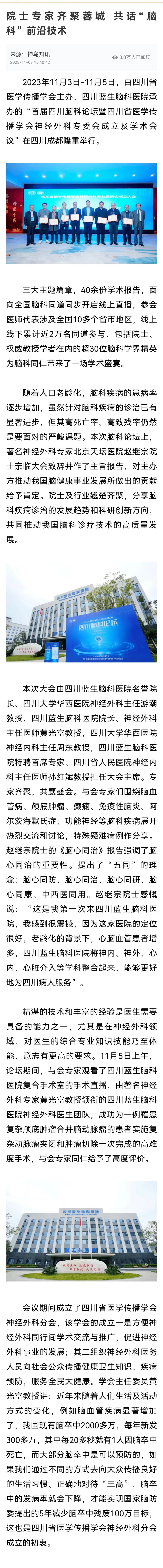 2023年11月3日-11月5日,由四川省醫(yī)學(xué)傳播學(xué)會(huì)主辦,四川藍(lán)生腦科醫(yī)院承辦的“首屆四川腦科論壇暨四川省醫(yī)學(xué)傳播學(xué)會(huì)神經(jīng)外科專委會(huì)成立及學(xué)術(shù)會(huì)議”在四川成都隆重舉行。