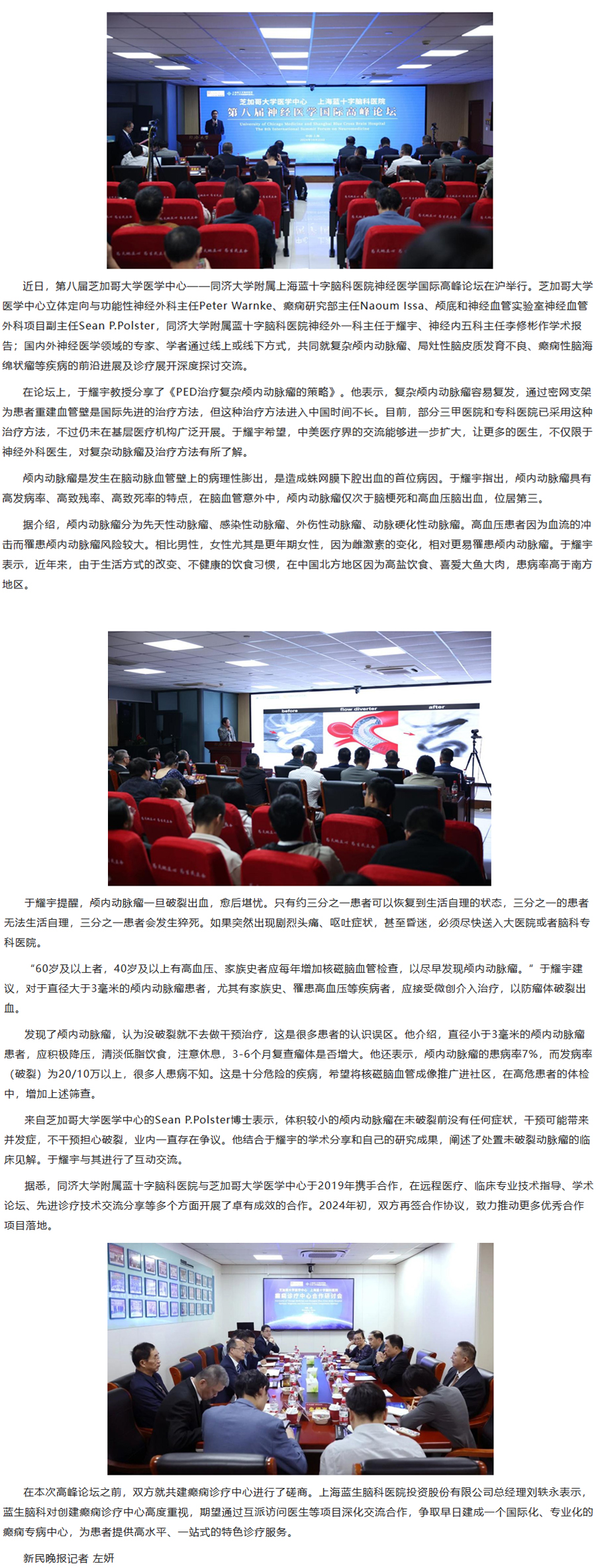 近日,第八屆芝加哥大學醫學中心——同濟大學附屬上海藍十字腦科醫院神經醫學國際高峰論壇在滬舉行。芝加哥大學醫學中心立體定向與功能性神經外科主任Peter Warnke、癲癇研究部主任Naoum Issa、顱底和神經血管實驗室神經血管外科項目副主任Sean P.Polster,同濟大學附屬藍十字腦科醫院神經外一科主任于耀宇、神經內五科主任李修彬作學術報告......