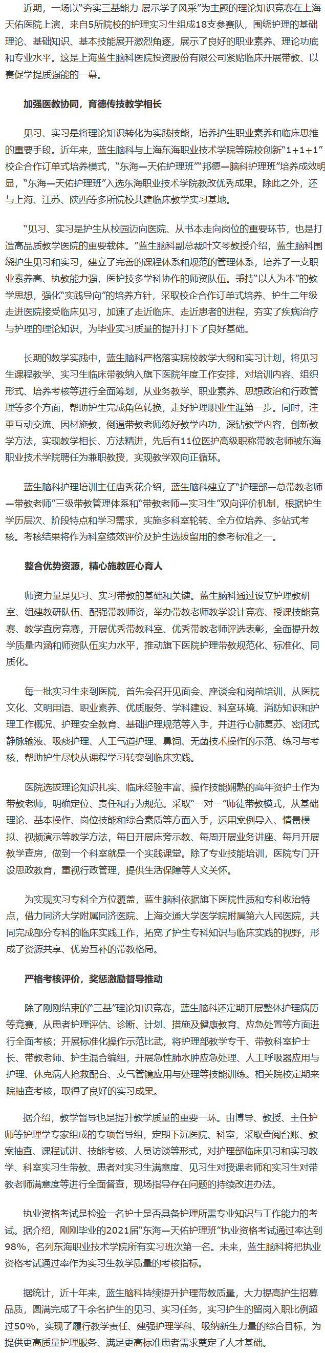近期,一場(chǎng)以“夯實(shí)三基能力 展示學(xué)子風(fēng)采”為主題的理論知識(shí)競(jìng)賽在上海天佑醫(yī)院上演,來自5所院校的護(hù)理實(shí)習(xí)生組成18支參賽隊(duì),圍繞護(hù)理的基礎(chǔ)理論、基礎(chǔ)知識(shí)、基本技能展開激烈角逐,展示了良好的職業(yè)素養(yǎng)、理論功底和專業(yè)水平。這是上海藍(lán)生腦科醫(yī)院投資股份有限公司緊貼臨床開展帶教、以賽促學(xué)提質(zhì)強(qiáng)能的一幕。