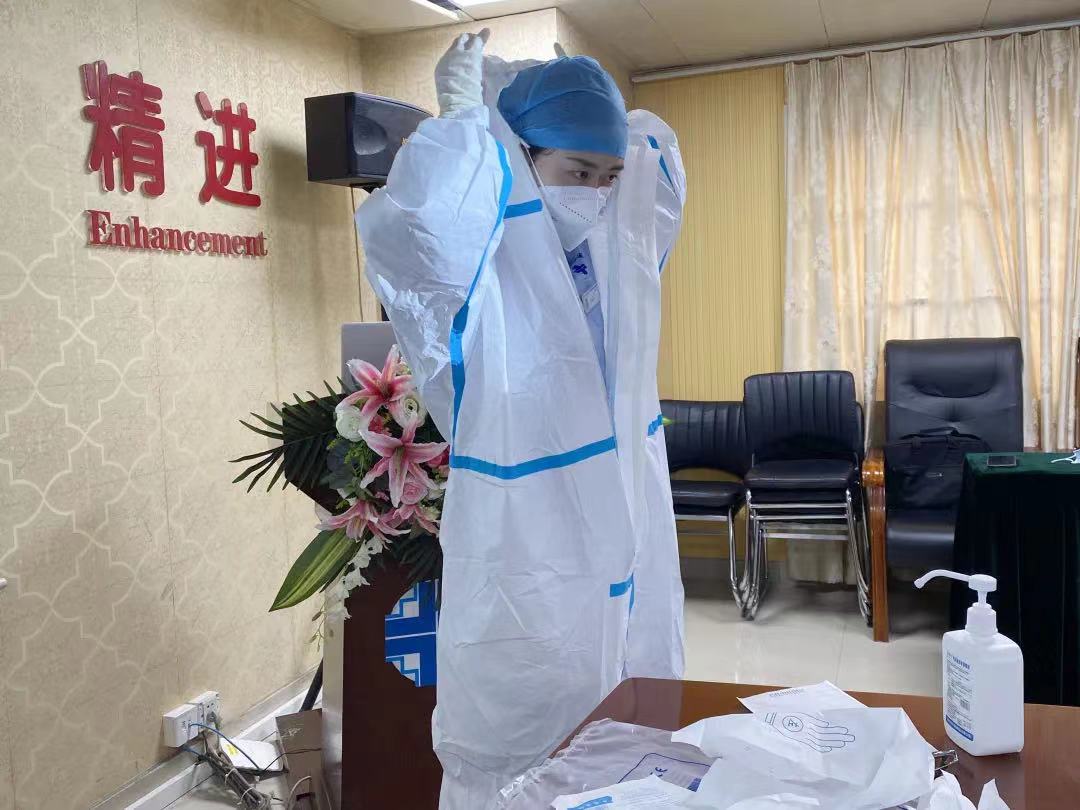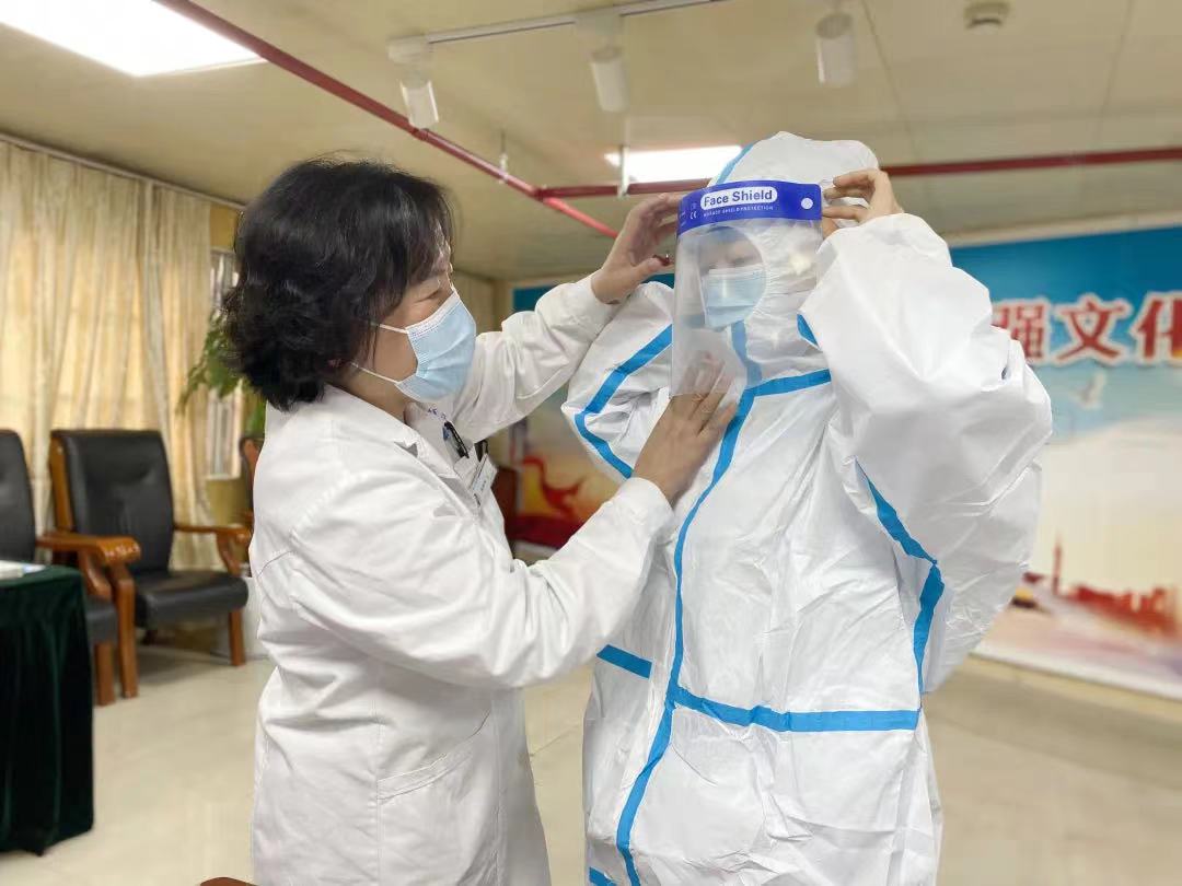 四病區護士長于如如現場指導示范穿戴防護服和消毒隔離的正確操作,通過結合視頻課件和實操培訓,隊員們逐一通過考核并完成采樣崗前防控培訓。