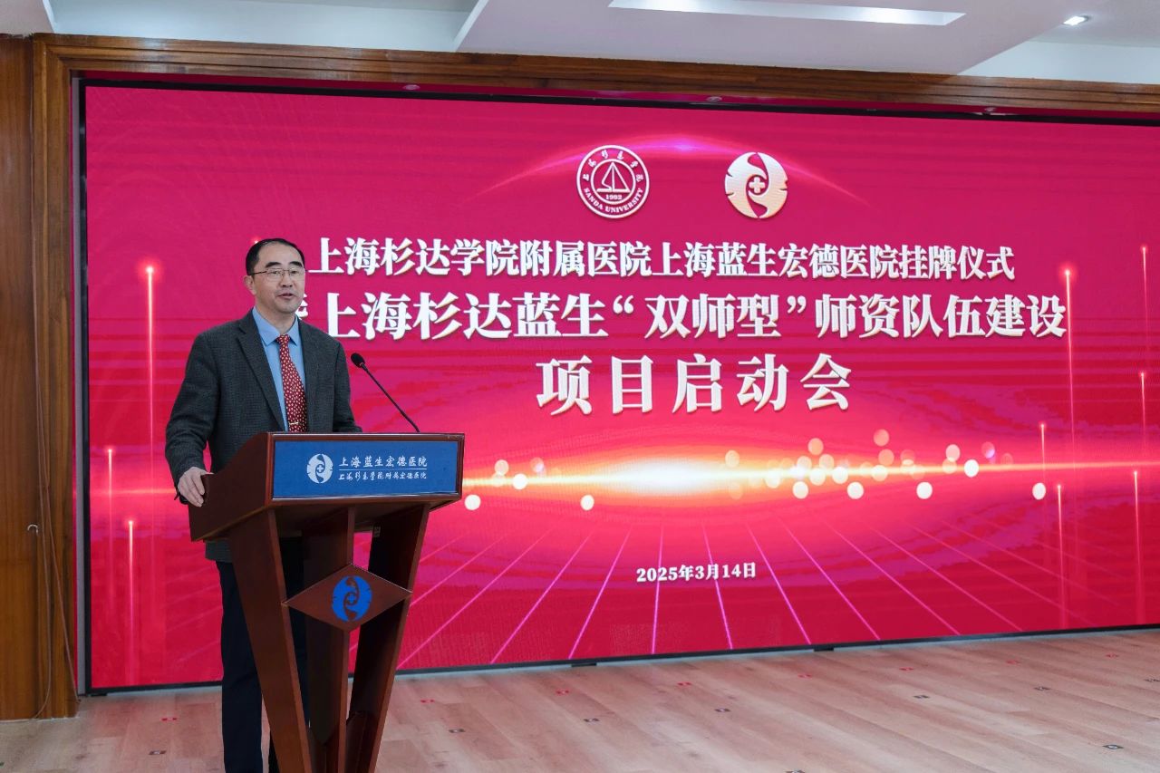 陳以一校長在講話中表示:“醫學教育是產教融合最深入、最實際、做得最有效的學科,必須扎根臨床實踐土壤。杉達學院與藍生腦科的合作是學校醫學教育史上的里程碑事件,是構建‘產教融合’生態鏈的關鍵一步,不僅對學校的醫學教育具有重大的意義,對學校未來的整體發展也有不可估量的作用。雙方僅用了不到三個月時間,便完成了從簽約到掛牌的所有工作,充分體現了雙方的誠意和效率。杉達學院作為一所應用型高校,將數字技術牽引的現代服務業和城市高品質生活作為學科專業發展主線和研究主題,謀劃把大健康作為這一主題下學校發展的特色來培育。未來,學校將依托藍生腦科的臨床資源,推動課程體系與臨床需求動態適配,在教學、科研等方面緊密合作,真正實現校企雙贏、學生‘畢業即勝任’。”