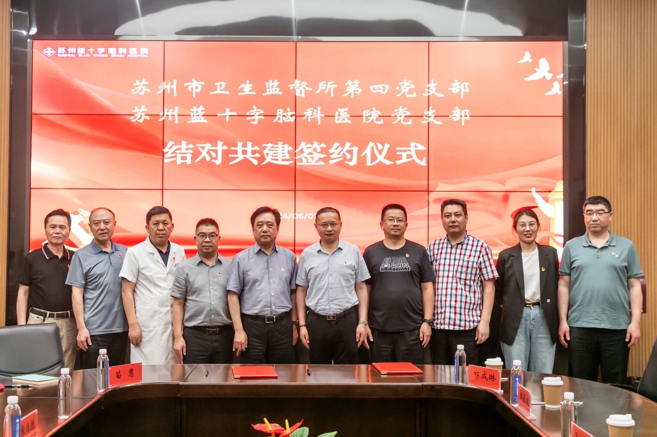 為深入貫徹落實習近平總書記關于黨的建設重要講話精神和指示要求,將新時代黨的建設總要求和新時代黨的組織路線落到實處,加強黨組織互融共進、優勢互補,開創“黨建引領、凝聚共識、推動發展”的新格局,2024年6月7日,蘇州藍十字腦科醫院黨支部與蘇州市衛生監督所第四黨支部舉行“結對共建”簽約揭牌儀式,醫院黨支部書記徐必生同志及黨員代表,蘇州市衛生監督所副所長張家兵及成員代表,雙方相關部門負責同志參加簽約儀式。