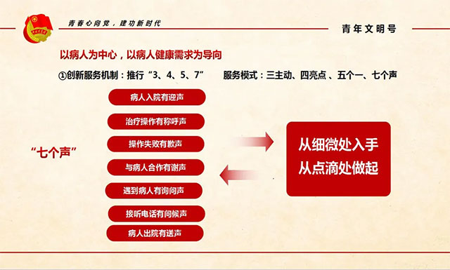 始終堅(jiān)持以病人為中心,以病人健康需求為導(dǎo)向,創(chuàng)新服務(wù)機(jī)制,推行“3、4、5、7”的服務(wù)模式,即“三主動、四亮點(diǎn) 、五個一、七個聲”,從細(xì)微處入手,從點(diǎn)滴處做起,讓患者滿意,讓患者感動。