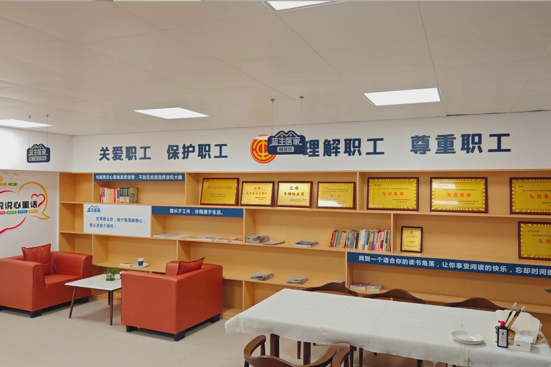 職工之家位于醫院4號樓六樓,設計巧妙融合了現代簡約與傳統美學,為職工打造了一個集休息、學習、交流與放松于一體的全方位多功能空間。這里設有舒適的休閑區,供職工放松疲憊身心;運動區配備了齊全的健身設施,鼓勵職工保持活力與健康;溫馨的閱讀角則提供了豐富的醫學書籍與人文讀物,滋養心靈,拓寬視野。