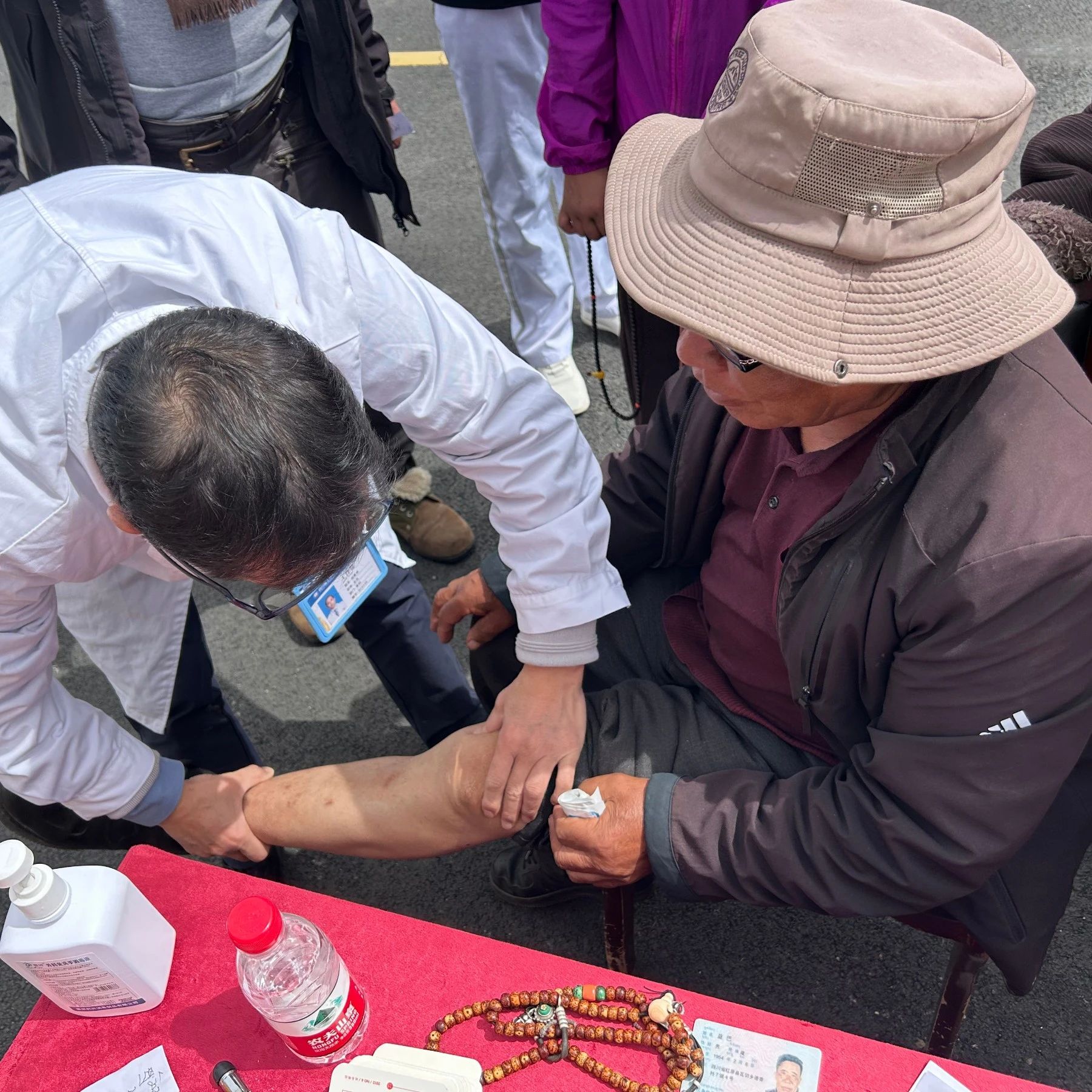 義診現場,段勇將主任帶領醫療小組有條不紊地開展工作。他們俯身細致檢查每一位患者的膝關節、髖關節及腰椎狀況,精準診斷疾病隱患;護士們為居民測量血壓,一邊輕聲安撫緊張的老人,一邊快速記錄健康數據;藏漢雙語翻譯穿梭于人群中,用藏語輕聲傳遞醫生的專業診斷和治療建議以及“減少負重勞作”“注意關節保暖” 等醫囑,鼓勵他們樹立戰勝疾病的信心。