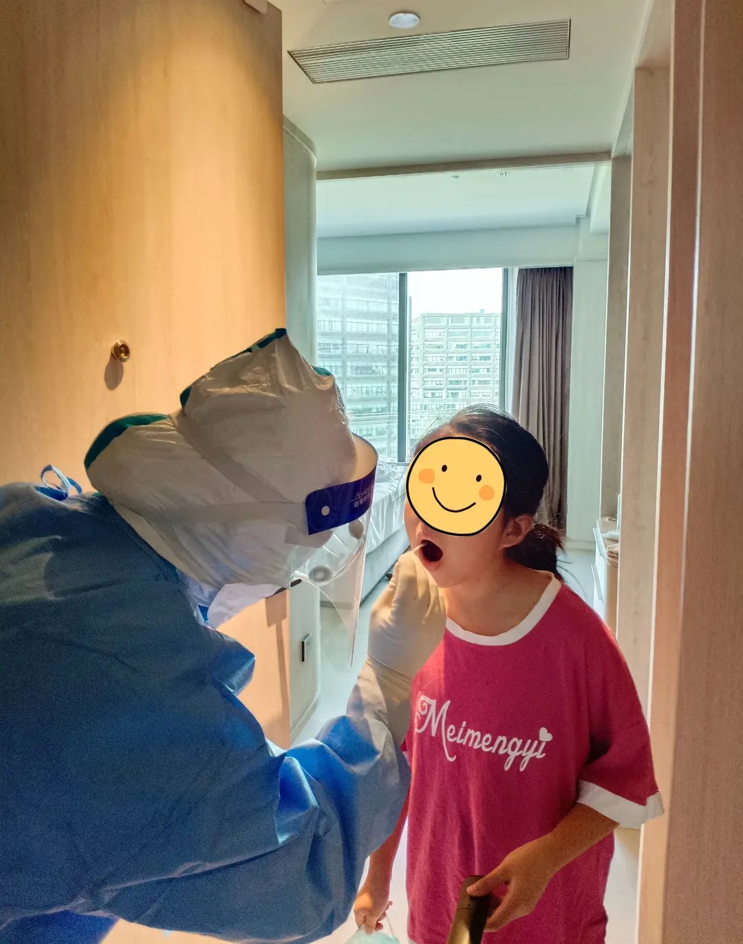 在長風商務區支援防疫的我,主要負責給隔離人員采集核酸。穿著厚厚的防護服挨個樓層敲門采集核酸,測量體溫,遇到不會操作核酸碼的老人需要耐心指導,有人困惑時需要耐心解答,有人焦慮時需要暖心安撫,我所做的這一切就是為了幫助他們順利度過隔離期。盡管每天的工作消耗著大量的體力,脫下防護服時衣服都被汗水浸透,面龐早已被面罩壓出勒痕,但是每當聽到小朋友說一句“謝謝大白阿姨”,每當聽到叔叔阿姨問一句“午飯吃了沒”,陣陣暖流就涌入到我的心間,感覺所有的辛勤付出都值得。
