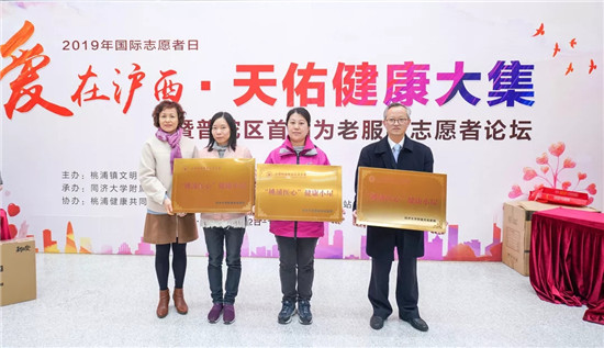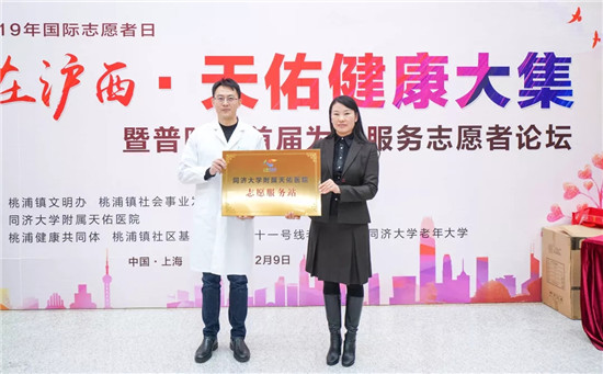 12月2日下午,天佑醫院成功舉辦了第四屆“愛在滬西 天佑健康大集”。在這次大集上,桃浦鎮文明辦副主任秦春華為“同濟大學附屬天佑醫院志愿服務站”授牌。
